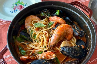 fresh seafood, summer veg, long pasta, and sauce for sopping